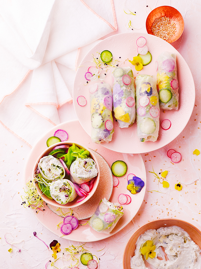 ④• Posez un torchon propre humide devant vous, trempez une feuille de riz dans un saladier d’eau tiède puis posez-la sur le torchon. Mettez quelques graines de sésame en haut de la feuille et alignez des rondelles de concombre, de radis et des fleurs.