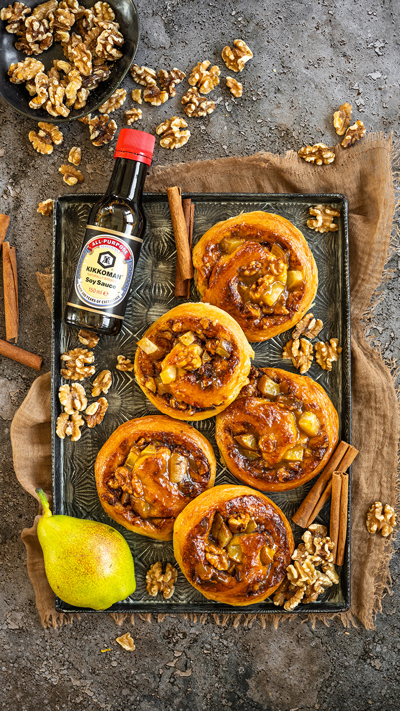 En plus des poires et des morceaux de noix, ce grand classique surprend par l’adjonction d’un trait de sauce soja. Si vous aimez déjà les roulés à la cannelle, alors vous allez adorer notre version !