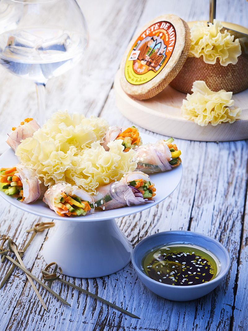 Roulés aux langoustines accompagnés de Tête de Moine AOP