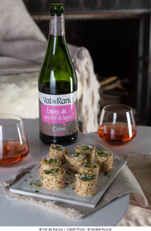 « Le cidre rosé Envies de… Apéritif & tapas joue l’accord parfait avec les crêpes-tapas salées, remplaçant avantageusement le vin ou la sangria. Raffiné, désaltérant, moins sucré qu’un cidre doux et plus acidulé qu’un cidre brut, il offre une fraîcheur intense et un arôme de fruits exotiques. Un équilibre composé par notre maître de chai autour de trois variétés de pommes : la chair juteuse et sucrée du Rouget de dol, la fraîcheur de la Guillevic et la tonicité de l’Avrolles. Cette vivacité tranche avec l’onctuosité du fromage frais.