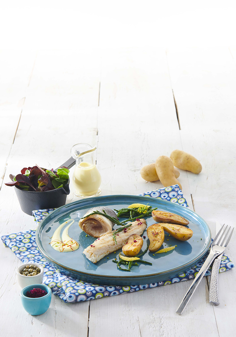 Roulés de filets de bar, Ratte du Touquet croustillantes et salicorne