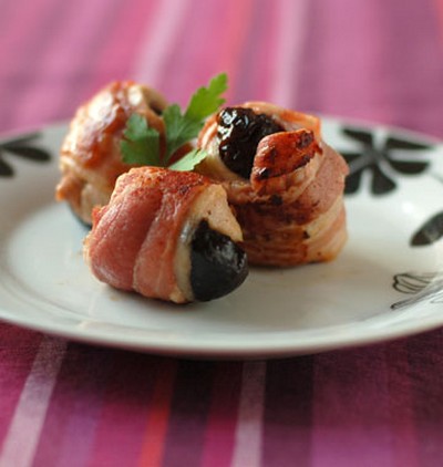 3. Enroulez ensuite dans une tranche de lard. Faites de même avec le reste des ingrédients.