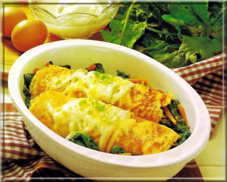 4.Rouler les omelettes et les poser sur les légumes. Saupoudrer d'emmental et passer 1 à 2 min sous le gril du four pour faire fondre le fromage.