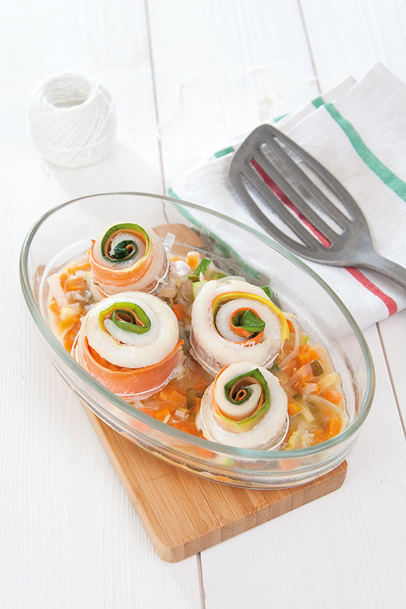 En option : réaliser une sauce en mixant la garniture aromatique (dés de carottes et vert de poireau ciselé dans le jus de cuisson) avec 4 cuillerées à soupe de crème fraîche. Chauffer puis servir les roulés de poisson nappés de cette sauce.