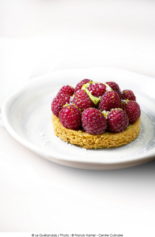 ⑩• Lorsque la pâte est refroidie, étaler dessus une très fine couche de pâte de citron sucrée et recouvrir de framboises.
