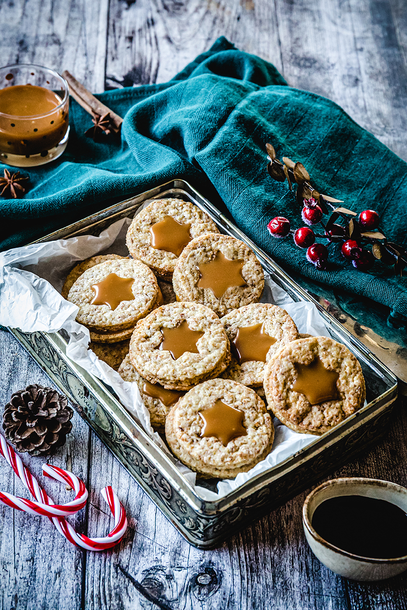 Dans une poche à douille munie d’un embout lisse, transférer le caramel. Disposer un peu de cette garniture sur les sablés entiers. Recouvrir à chaque fois d’un sablé troué au centre.