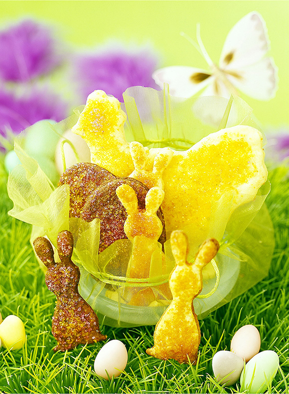 ⑤• Abaisser les trois pâtes au rouleau à pâtisserie sur 3 millimètres d’épaisseur. Y découper des ovales du gabarit d’un œuf, ainsi que des poules et des lapins (ou tout autre sujet de Pâques) à l’emporte-pièce (ou à l’aide d’un gabarit).