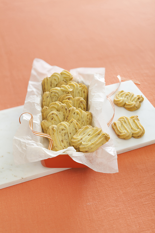 ⑥• Garnir une poche à douille avec un embout cannelé de 6mm. Sur une plaque recouverte de papier cuisson, dresser les sablés en formant un « W ». Veiller à bien les espacer !