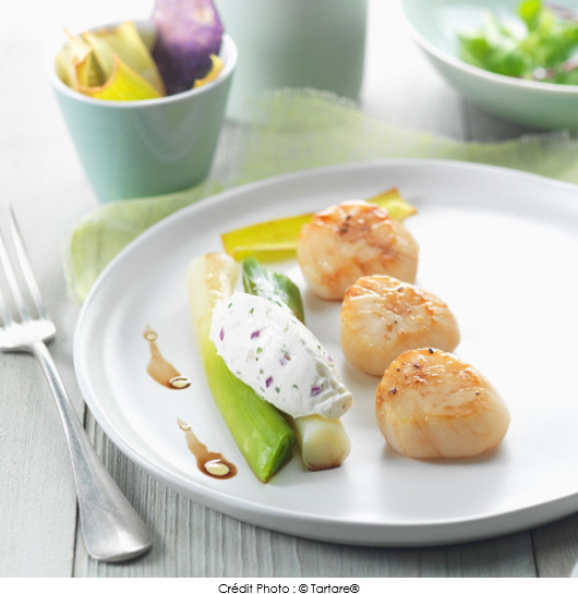 Saint-Jacques caramélisées, poireaux vinaigrette et Tartare® Oignon rouge & Coriandre