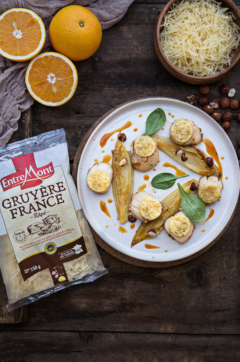 Saint-Jacques chips de Gruyère Entremont, endives et jus d’orange