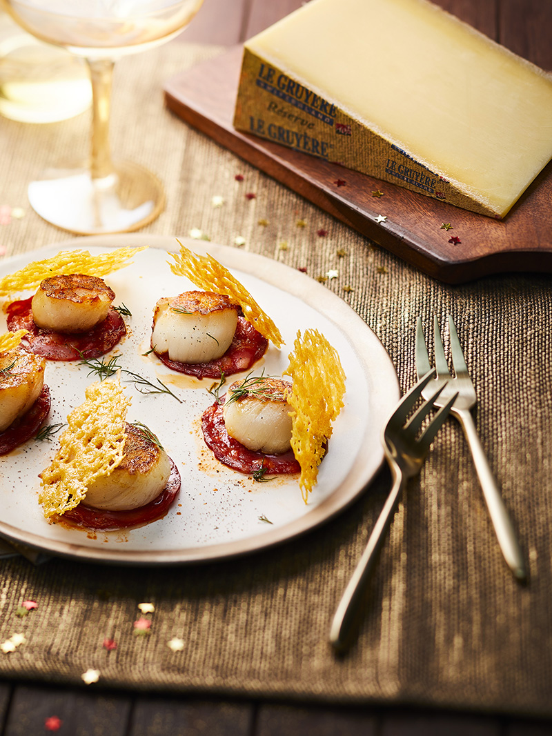 Déposez les noix de Saint-Jacques sur le chorizo, agrémentez des chips de Gruyère AOP Suisse. Servez aussitôt.