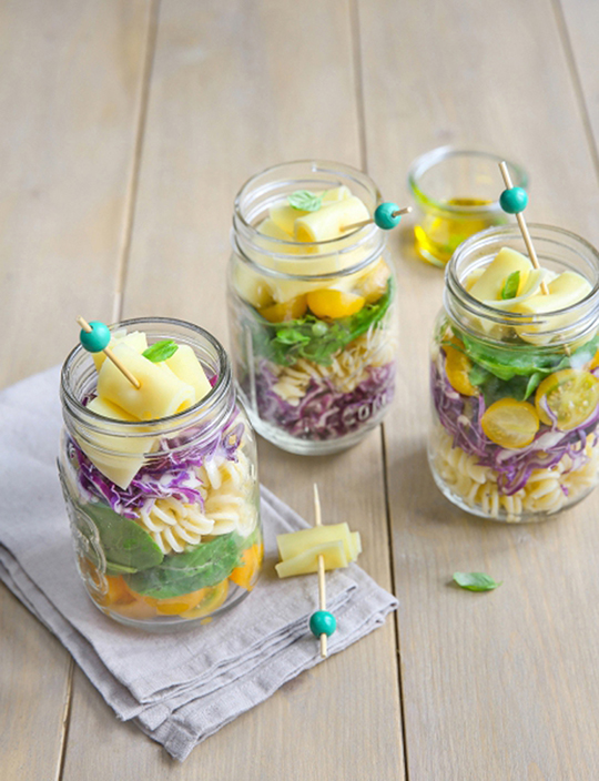 ①• Disposer 100g de pâtes cuites dans le fond du jar.