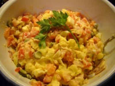 8.Dans un saladier mettre la mayonnaise, les tomates, les œufs, les cornichons, le jambon et les pommes de terre