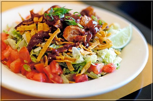 Disposer les feuilles de salade et les légumes sur quatre assiettes.
