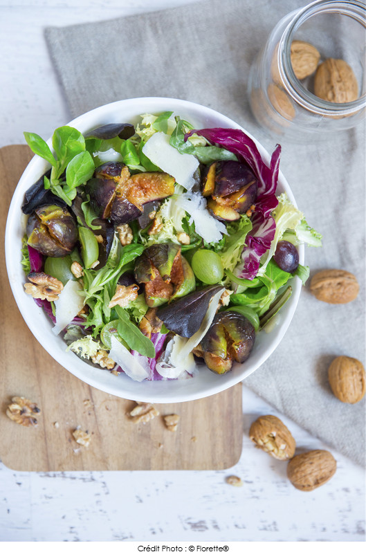 ⑥• Préparez les assiettes : déposez la salade au centre puis ajoutez les figues tièdes et quelques copeaux de parmesan. Terminez par les cerneaux de noix torréfiés.