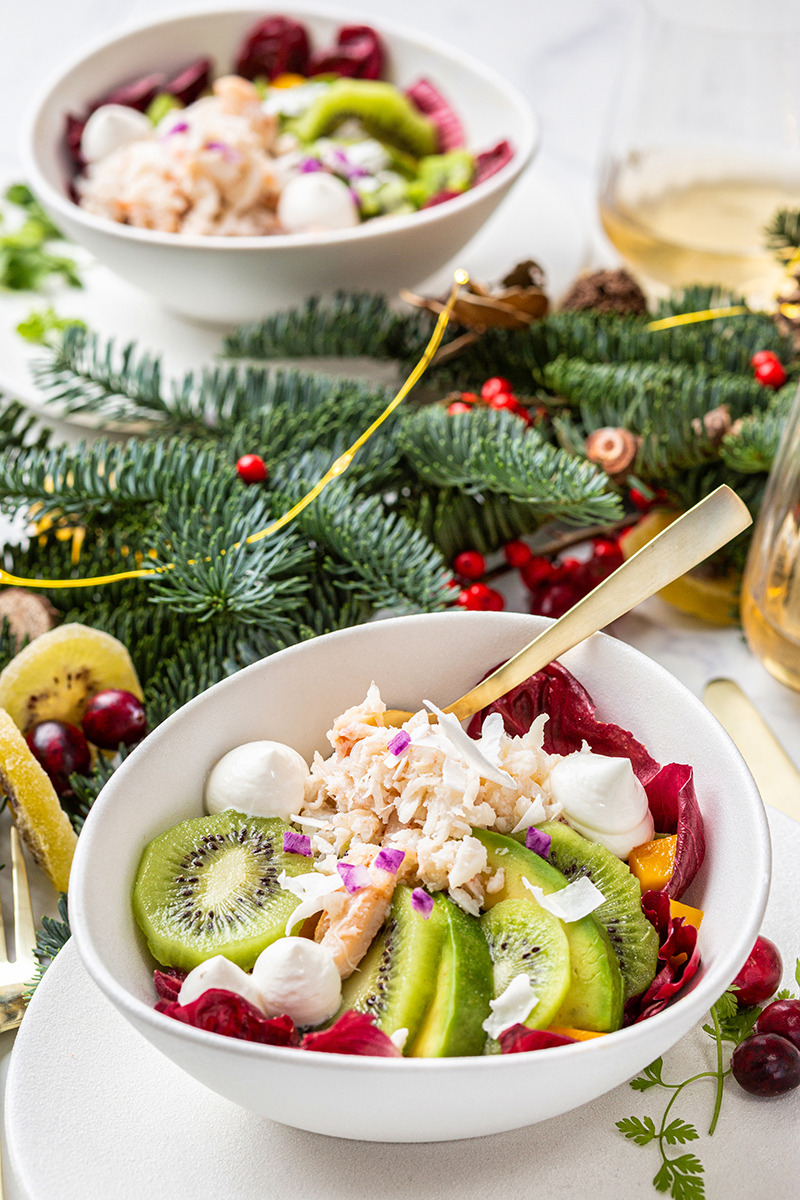 ⑤• Égoutter la chair de crabe et la déposer au centre du bol. Arroser les fruits et le crabe de vinaigrette.