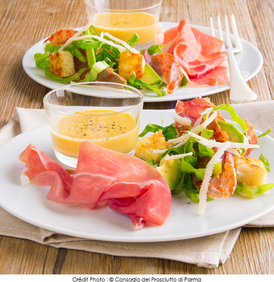⑥• Dressage : Déposer la salade dans une assiette et assaisonner de sauce, précédemment préparée. Décorer à l’aide du pain en cubes, du Jambon de Parme grillé, de tranches d’avocat, et d’une poignée de Parmigiano Reggiano, coupé en fins copeaux.