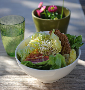 5.Disposer la salade dans une assiette ou un bol, les filets de rougets tièdes, le pain coupé en deux et les graines germées.