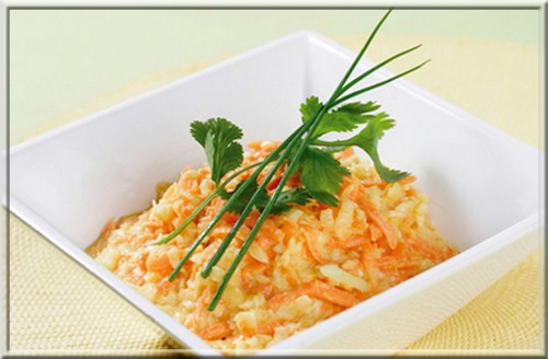 2.Emincer la carotte et le chou blanc. Réunir les légumes râpés dans un saladier et mélanger avec la mayonnaise. Réserver au frais jusqu'au moment de servir.