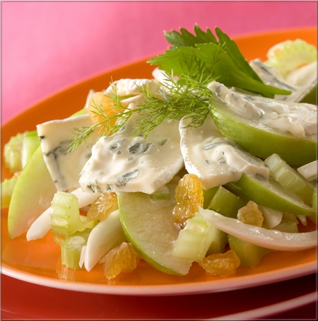 Voici une salade toute en parfums, mariant le salé au sucré des raisins secs et des pommes et à la saveur anisée du fenouil. Le crémeux du Bresse Bleu l’équilibre agréablement