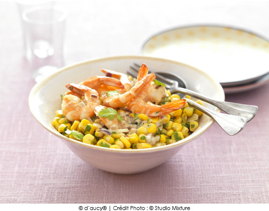 ①• Égouttez le maïs ultra croquant d’aucy. Décortiquez les crevettes, ôtez les têtes.