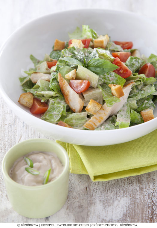Parfumez la salade avec un peu de basilic ciselé et en variante remplacez les filets de poulet par des anchois marinés.
