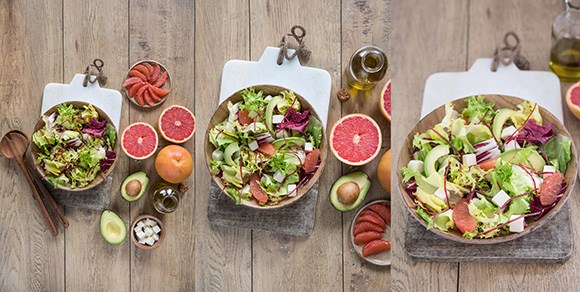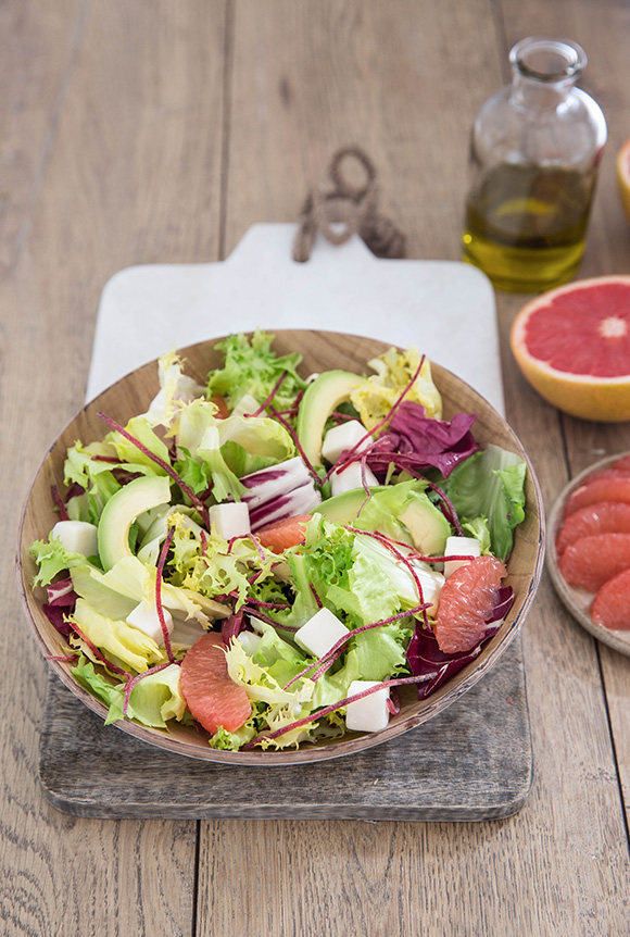 ⑤• Mélanger la salade avec les suprêmes de pamplemousse, la feta, les lamelles d’avocat. Ajouter la sauce.