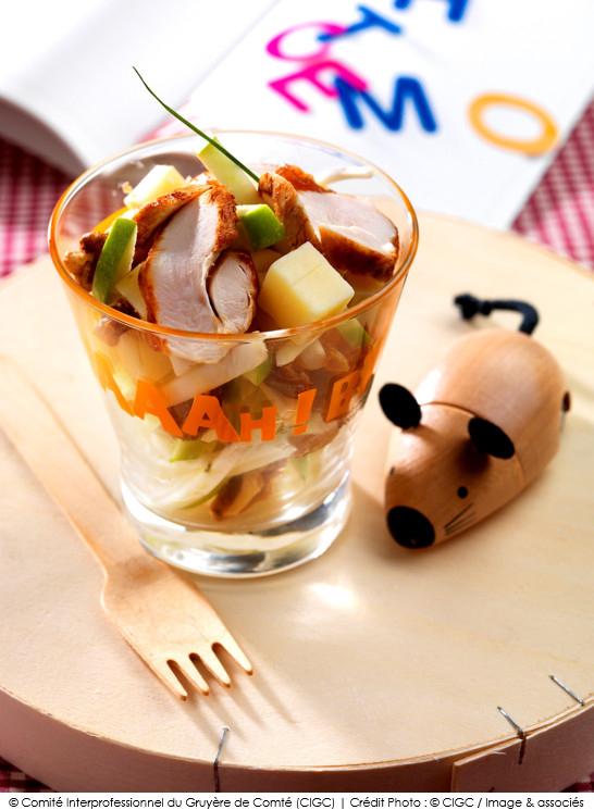 ①• Laver la pomme, la couper en 4, l’épépiner et mélanger dans le saladier de service avec la moitié du jus de citron. Ajouter le céleri râpé et les lanières de poulet. Mélanger avec le reste du jus de citron, et ajouter les raisins et les cerneaux de noix.