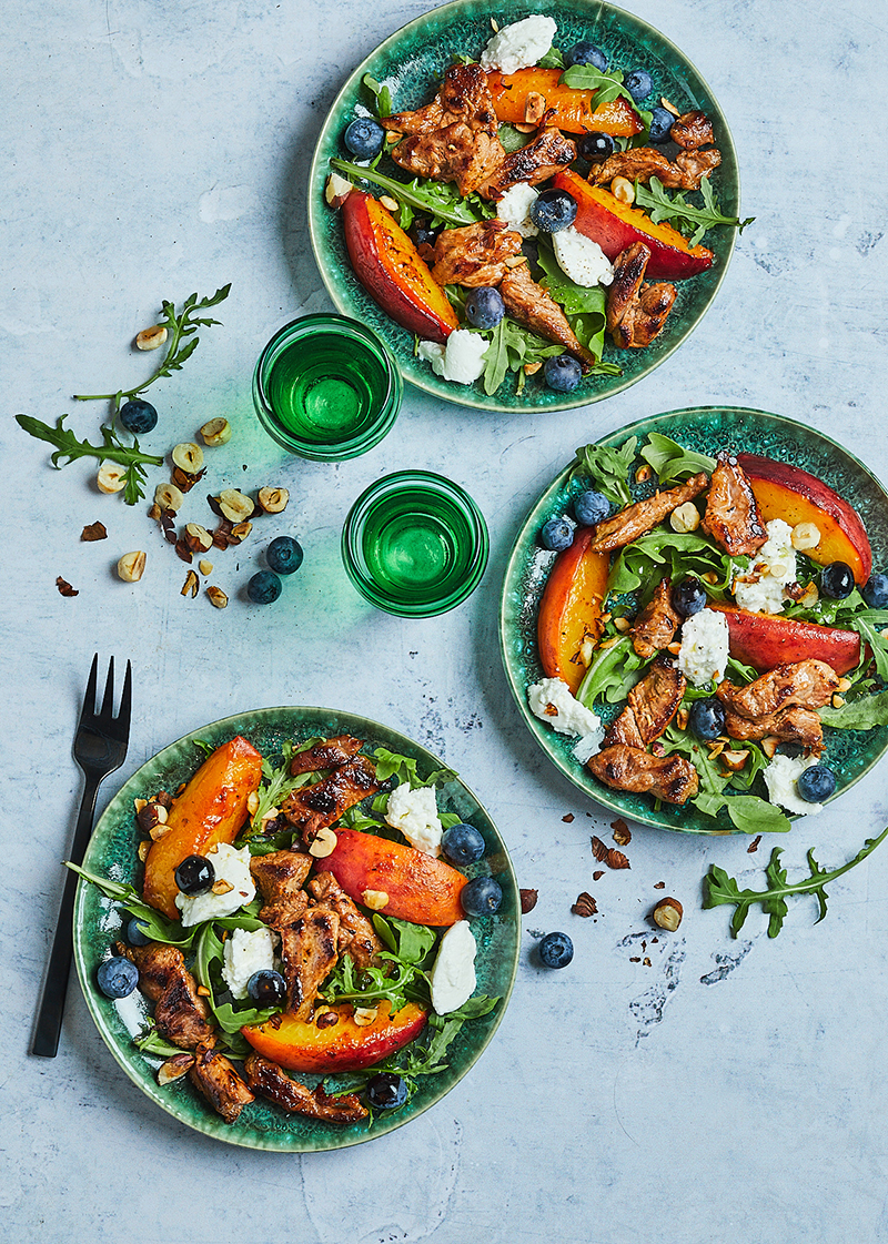 Salade d’agneau aux pêches rôties, chèvre frais, myrtilles et noisettes