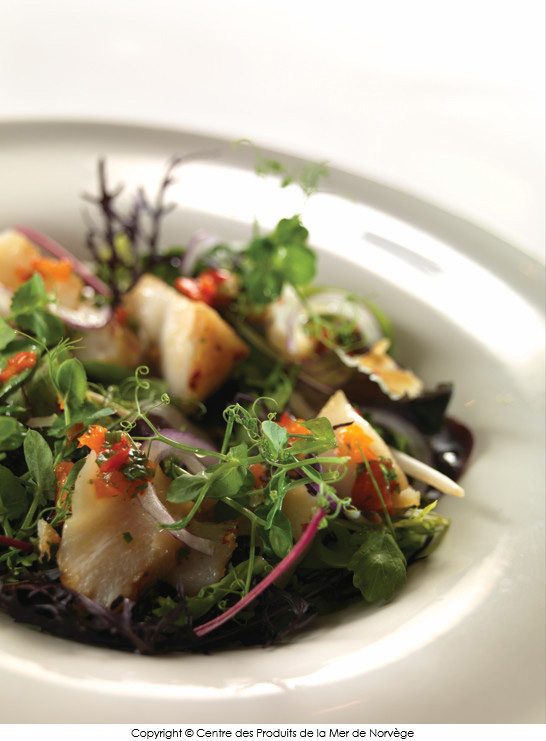 ④• Mélanger la salade avec le cresson et y déposer des morceaux de cabillaud de Norvège.