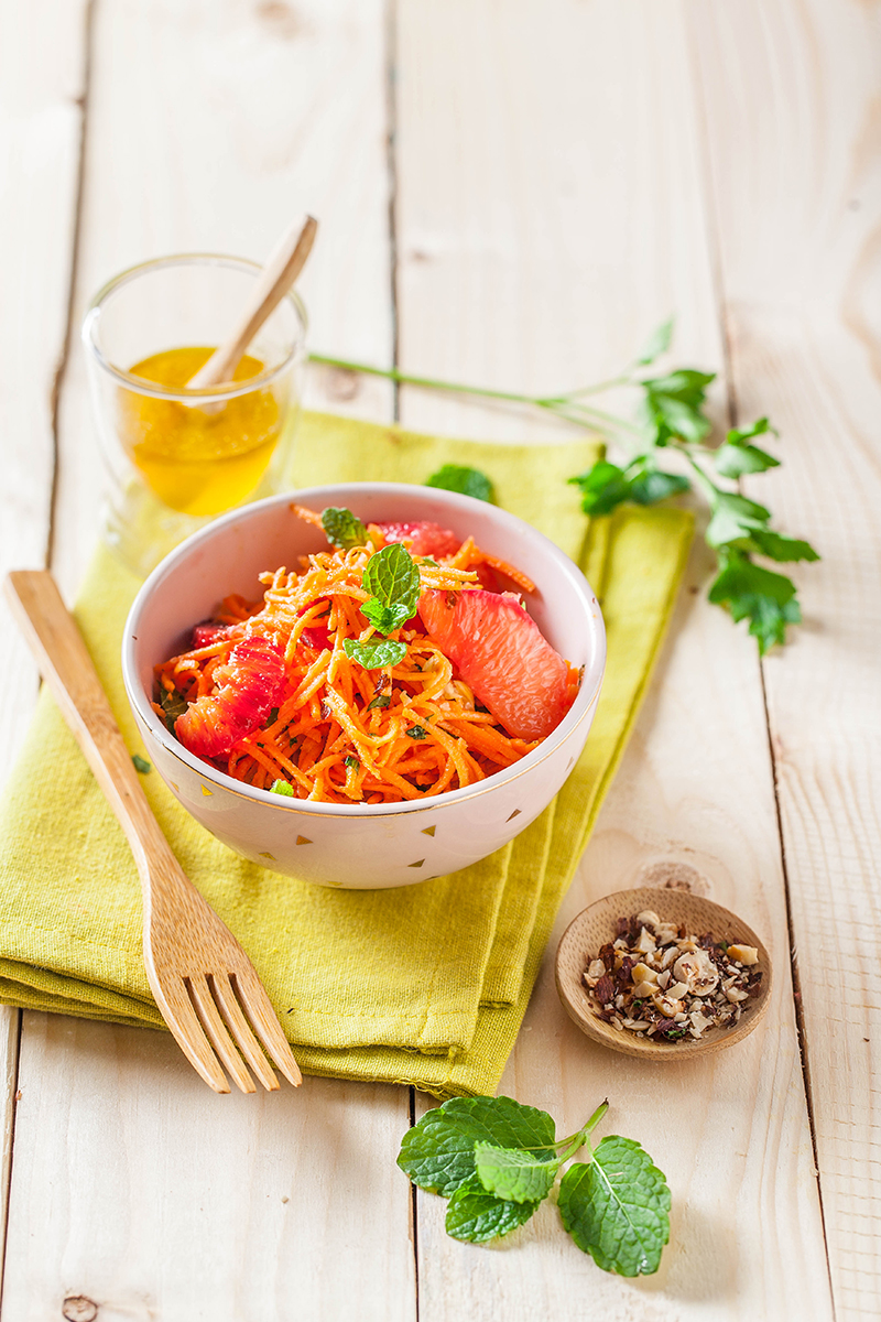 ③• Dans un saladier, mélanger les carottes râpées avec les feuilles de Persil Plat et la Menthe ciselée Florette. Ajouter la moitié de la vinaigrette, des agrumes et des noisettes et mélanger.