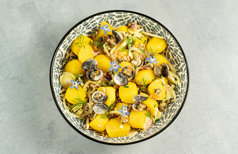 Une salade rafraîchissante et savoureuse alliant la fraîcheur des coques à la délicatesse des pommes de terre safranées. Un mariage subtil de saveurs marines et terrestres qui éveillera vos papilles.