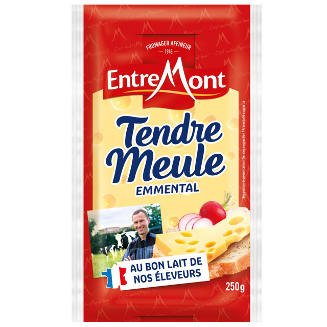 Issu d’une stricte sélection – une meule sur cinq environ est sélectionnée par Entremont – l’Emmental Tendre Meule bénéficie d’une attention de chaque instant. Il est fabriqué à partir du lait collecté auprès des éleveurs français de la coopérative laitière Sodiaal, dont fait partie Entremont. Il est le fruit de la combinaison des expertises des producteurs, respectueux des bonnes pratiques d’élevage et de traite pour fournir un lait de qualité, et des maîtres-fromagers qui fabriquent et sélectionnent les meilleures meules pour proposer un Emmental au goût équilibré.