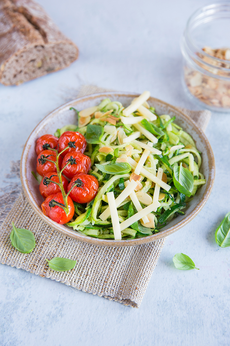 ②• Couper l’Emmental Tendre Meule Entremont en bâtonnets. Laver les courgettes et réaliser des spaghettis à l’aide d’un spiraliseur. Il est également possible de réaliser des spaghettis avec un économe type rasoir et de recouper les tagliatelles dans la longueur.