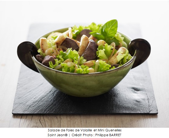 Dans les assiettes, disposer les feuilles de salade puis ajouter les foies de volailles et les mini quenelles.