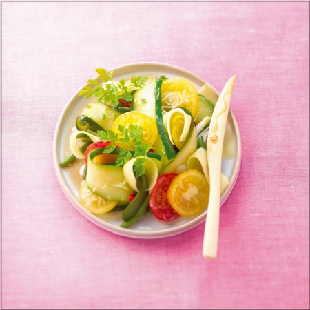 2• Lavez les courgettes, éliminez les extrémités et coupez-les en tranches dans la longueur. Cuisez-les, puis refroidissez-les comme les haricots verts. Attention la cuisson ne dure que 1 minute.