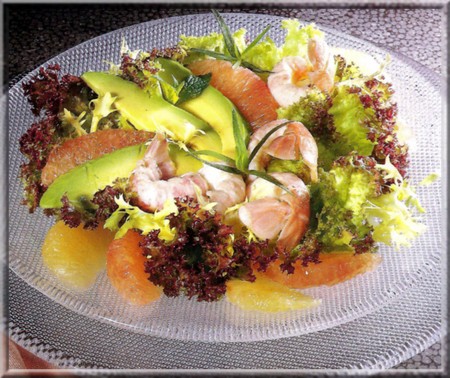 Dans chaque assiette, répartir les langoustines, l'avocat et le pamplemousse sur un lit de salade. Assaisonner avec la vinaigrette et parsemer d'estragon haché.