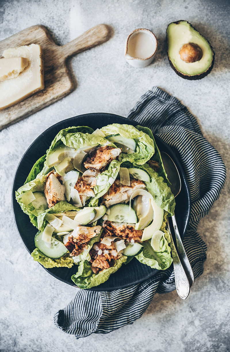 ⑥• Mélanger la salade avec l’avocat, le concombre, le parmesan râpé, et le lapin frit découpé en lamelles.