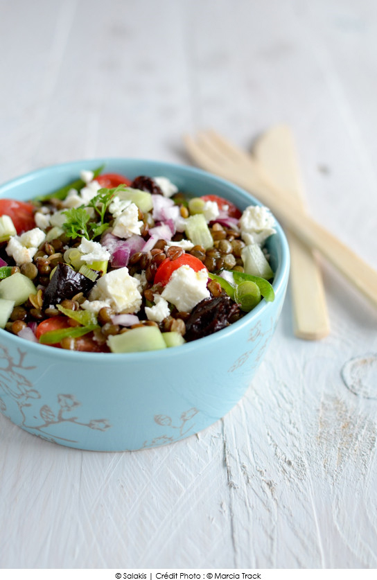 ⑦• Mélangez les lentilles refroidies avec tous les légumes, puis ajoutez le fromage Salakis en petits cubes.