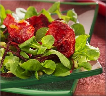 4- Faire frire rapidement les chips de betterave, les déposer avec les pailles. Gardez au chaud.