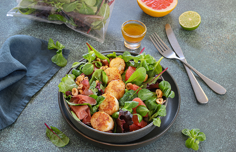 Salade de mâche et jeunes pousses au pomelo, Saint-Jacques et jambon Serrano