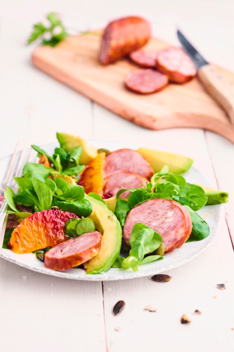 Salade de mâche, orange sanguine et saucisse de Montbéliard