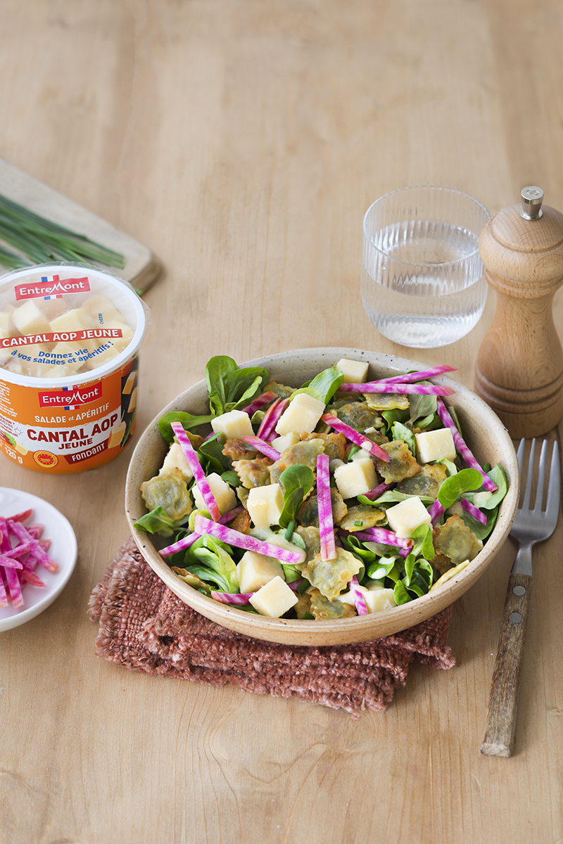 Salade de mâche, ravioles poêlées et cubes de Cantal AOP Entremont