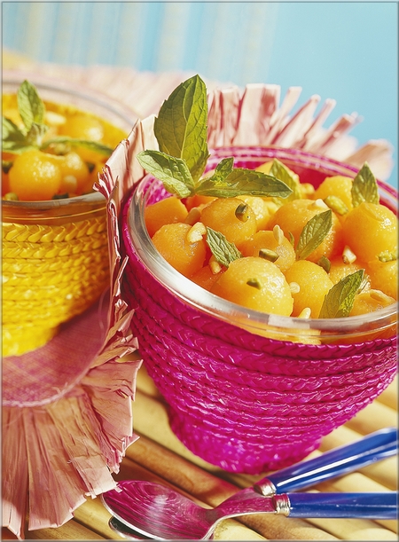 Pour servir, mettre la salade de melon dans une jolie jatte en verre, parsemer des pignons, amandes et pistaches.