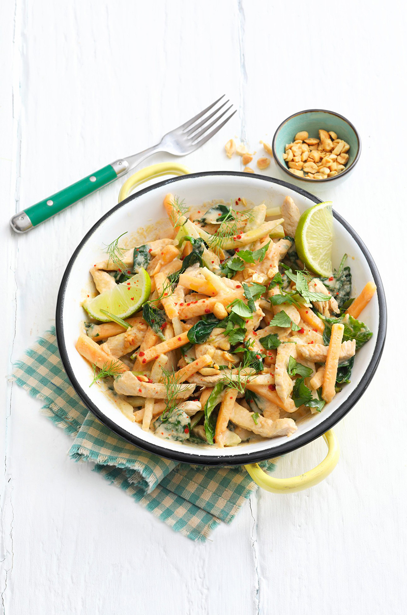 ①• Faites chauffer un filet d’huile dans une poêle et faites cuire les escalopes de dinde environ 10 minutes. Salez, poivrez et découpez-les en lamelles.