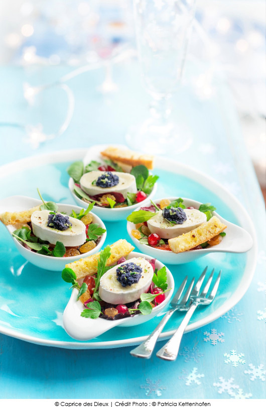 ④• Mélanger la salade, les raisins secs et les groseilles et répartir le tout dans de larges cuillères. Disposer une tranche d’ En Cas de Caprice sur chaque cuillère, puis déposer délicatement les œufs de poisson sur le fromage. Parsemer un peu de zeste de yuzu et du poivre.