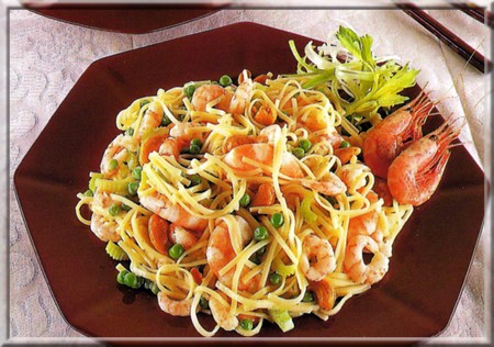 Au moment de servir, ajouter les crevettes, les nouilles et les noix de cajou, mélanger délicatement. On peut aussi émietter à la surface 1 ou 2 beignets chinois à la crevette.