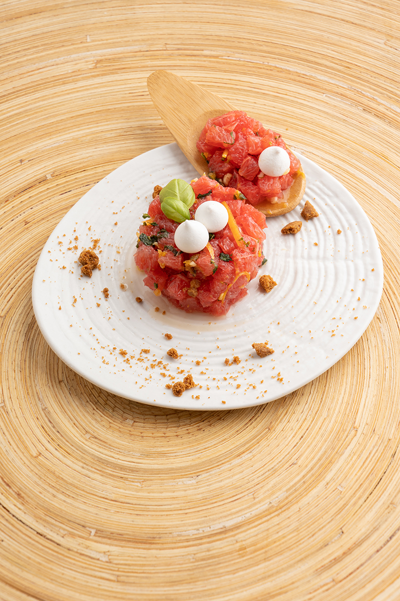 Salade de pamplemousse de Floride, meringue et spéculoos fins
