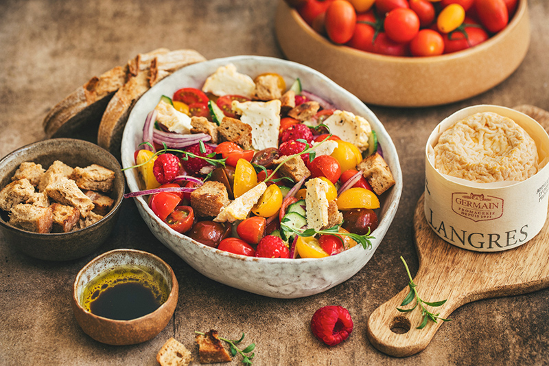 Généreuse et ensoleillée, cette salade marie la douceur du Langres AOP à la fraîcheur des tomates cerises, du concombre et des framboises, relevée d’un filet de balsamique et de basilic frais.