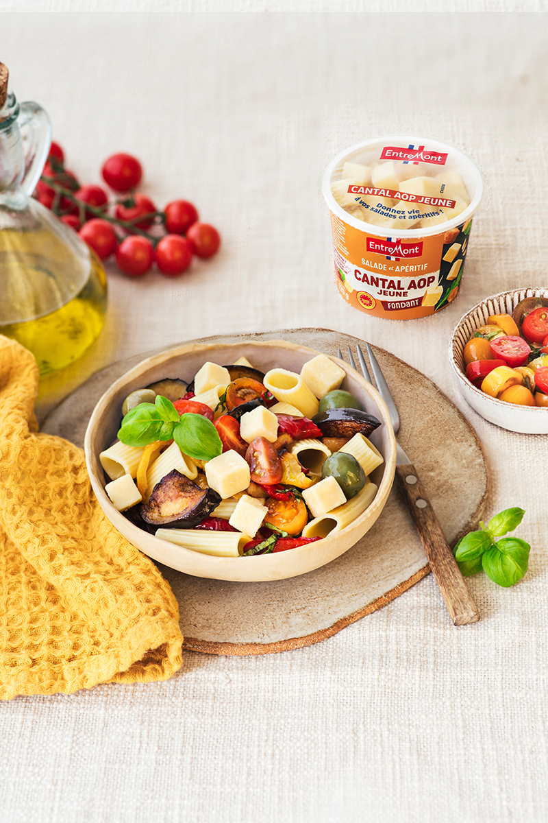 Salade de pâtes, olives vertes, légumes rôtis et cubes de Cantal AOP Entremont
